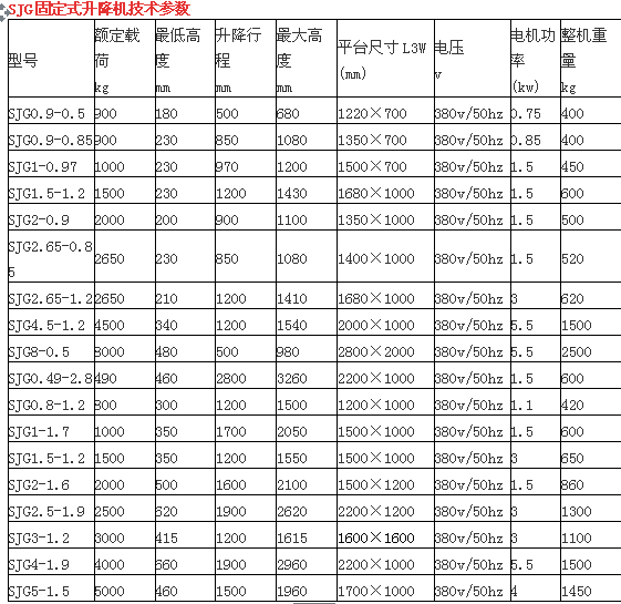 安裝形式:固定式液壓升降機(jī)適合在室內(nèi)外各種環(huán)境條件下安裝使用。它可根據(jù)使用要求,安裝在封閉的井道內(nèi)或暢開的樓層間;安裝在凹形基坑內(nèi)或平實(shí)的地面上。 技術(shù)參數(shù):由于受建筑物或工作擱層的高度,所載物體的大小、重量及其它使用要求的影響,其型號(hào)有很多不確定因素。當(dāng)列表所示型號(hào)不適合使用要求時(shí),可根據(jù)實(shí)際使用環(huán)境和操作要求,對(duì)升降臺(tái)的升高、承載量、平臺(tái)面積等進(jìn)行組合,以便取得理想的使用效果。